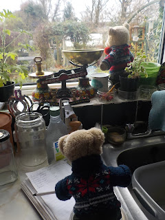 After doing some climbing in the lilac bushes and sniffing to see if there was a hedgehog hibernating in the den we made (sadly, we don't think there is), we ran half way up the path to the greenhouse. All pushing together, we could just get the door open far enough to squeeze in, so I could show the other bears the plants for the front garden bed and some other plants being grown from cuttings.