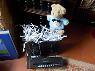 On Sunday and Monday, while it was wet and stormy, Horsey had his major surgery. Polar had to take out a lot of his stuffing and fluff it back up properly, mend some of his seams (which were strengthened with more of Grizzly's old trouser fabric) and then put his stuffing back in.The next day he had surgery on his back legs, tail and tummy. Polar needed some extra stuffing for him, so we found some (unused) washing-up sponges in the kitchen, and let Polar have some of the stuffing from the old cushion which we use as the mattress in our bear basket. She didn't want to over-stuff him and put pressure on his other seams, but she didn't want him to be too floppy either.