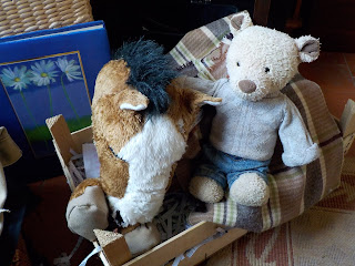 However, when Polar unwrapped Horsey's parcel, we found he was bigger than we had expected and won't be comfortable in the beer box, so Polar brought in one of the boxes we use to store our potatoes from the shed and, after giving him lots of hugs to make him welcome, we lined that with the shredded paper and made that into his stable instead.